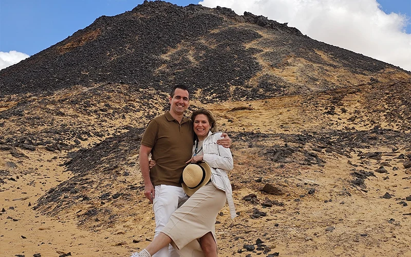 Frühmorgens Frühstück vor der Reise in die Schwarze Wüste rund um die Bahariya-Oase, wo das Eisen in der Wüste einer der Gründe dafür ist die schwarzen Felsen. Sie wandern zu Fuß, um Gabal el Marsos (Geteilter Berg) zu erkunden, und fahren dann in Richtung des kleinen Beduinendorfs El Hez, um die natürliche Quelle zu besuchen. Anschließend machen Sie eine Mittagspause im Freien und machen sich auf den Weg zur Weißen Wüste, 160 km auf der Straße/im Gelände Wir halten am Kristallberg und im Agabat-Tal El Sharkia, dem Baum El Santa und dem Blumenstein und fahren später in die neue weiße Wüste mit ihrer kalkigen, cremefarbenen Landschaft und den vom Wind geschnitzten pilzförmigen Formationen, die sowohl menschlichen als auch tierischen Gesichtern ähneln.